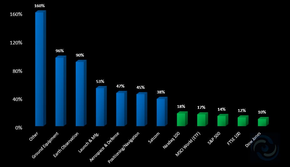 Over the past year, space tech stocks have left the big benchmarks far behind. While the S&P 500 and Nasdaq 100 grew by about 14–18%, most space sectors more than doubled, with areas like Earth Observation and Ground Equipment leading the way. Even the more traditional segments, like Launch and Satcom, grew much faster than the broader market.