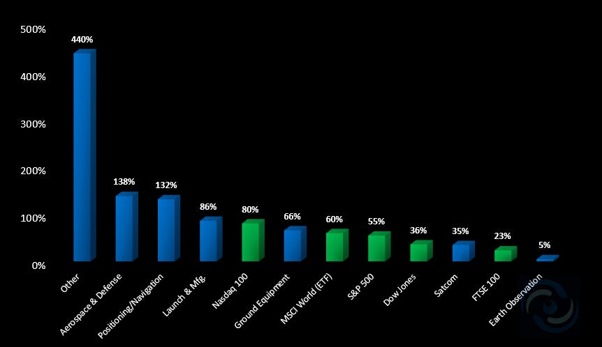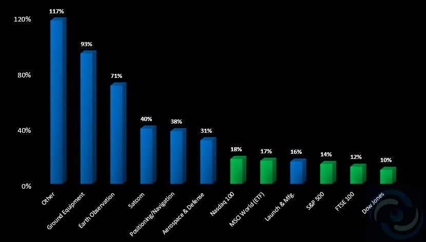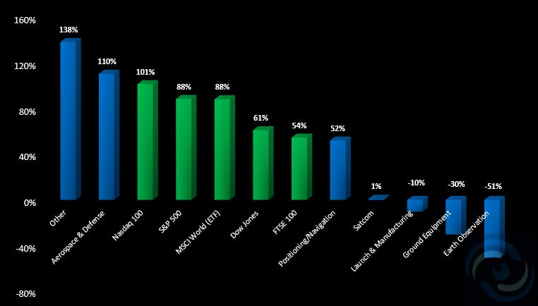 Even using medians, most space tech subsectors still outperformed major benchmarks like the S&P 500 and Nasdaq 100.