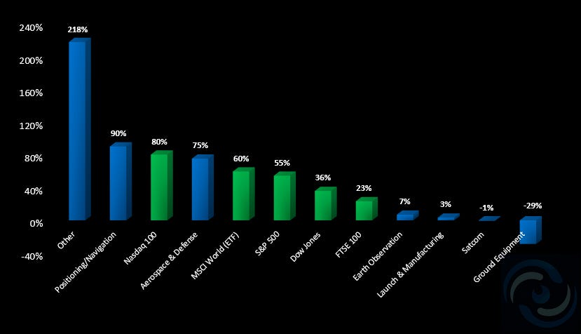 Some of the backbone sectors that are leading the three-year average performance story — Positioning/Navigation (+57%), Launch & Manufacturing (+45%), and Ground Equipment (+28%) — lagged over five years. Their explosive growth is more recent: reusable rockets, private launch cadence, and commercial navigation applications only began scaling in the past three to four years. Earlier in the period, launch was high-cost and irregular, and navigation lacked significant commercial traction, which is why the five-year returns still look modest compared to newer winners.