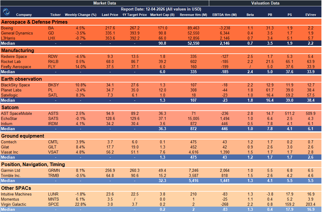 Weekly SpaceCap - These tables track weekly stock performance and key metrics for global and European SpaceTech companies, giving a quick snapshot of market trends. Data sourced from Yahoo Finance.