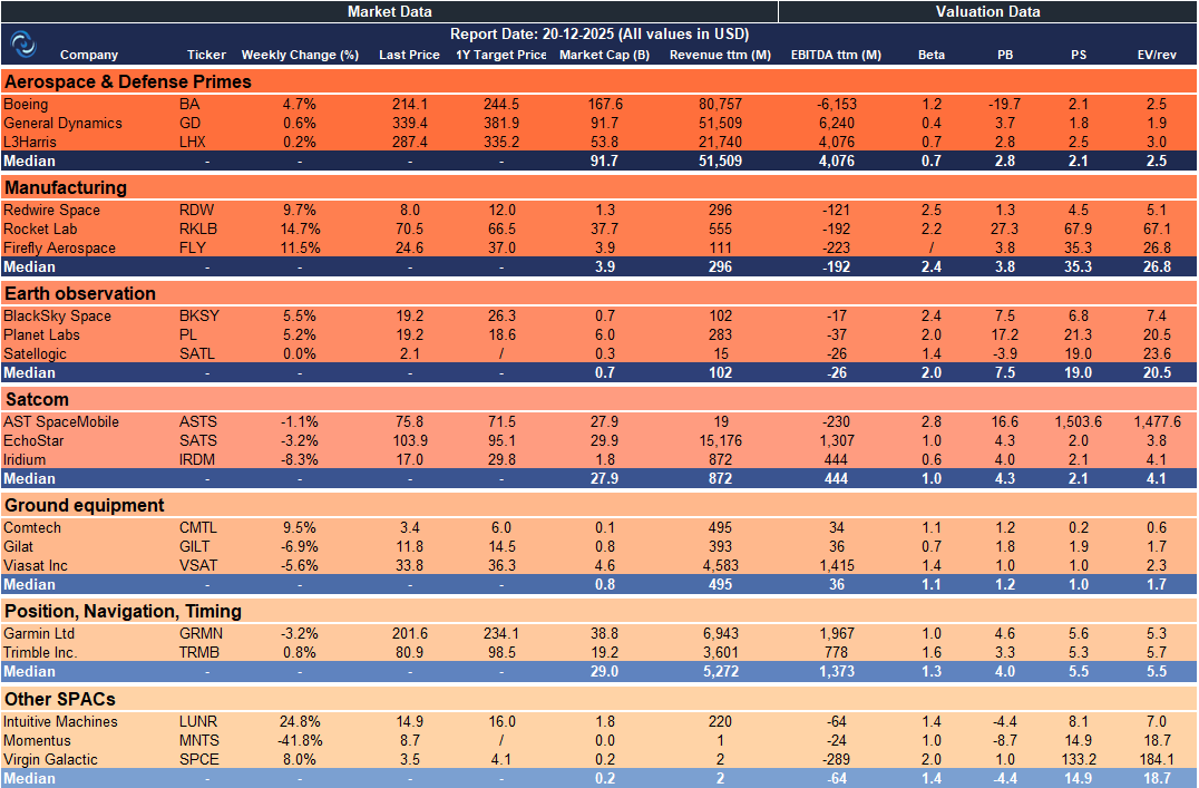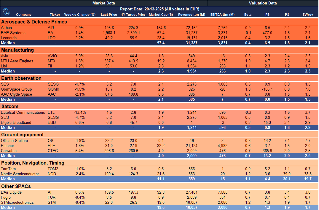 Weekly SpaceCap - These tables track weekly stock performance and key metrics for global and European SpaceTech companies, giving a quick snapshot of market trends. Data sourced from Yahoo Finance.