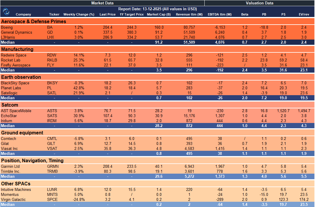 Weekly SpaceCap - These tables track weekly stock performance and key metrics for global and European SpaceTech companies, giving a quick snapshot of market trends.